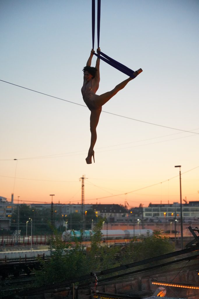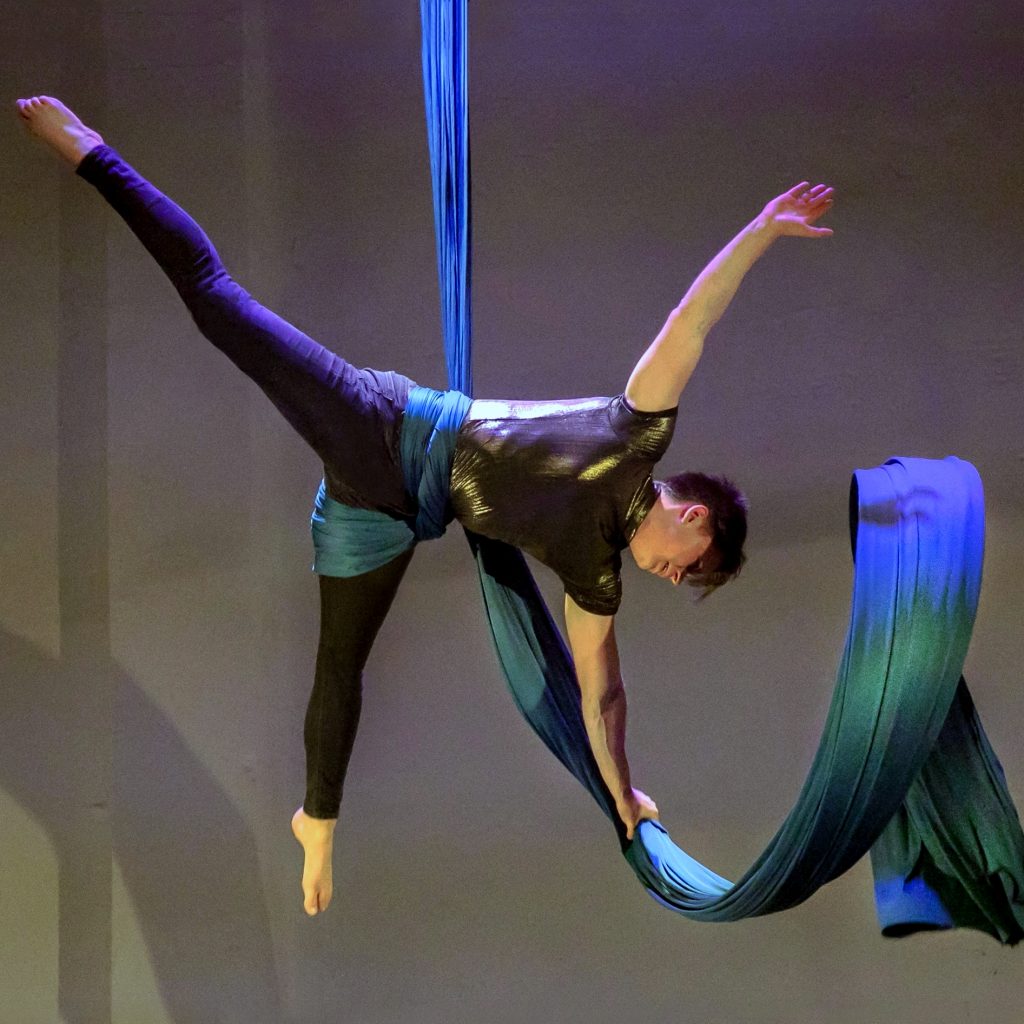Luftartistik am Tuch, am Vertikalseil und an den Strapaten. Außerdem am „Hoopsilk“ ein eigens kreiertes Requisit.